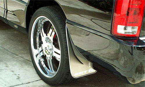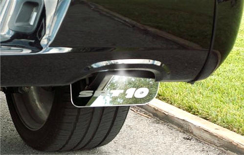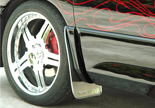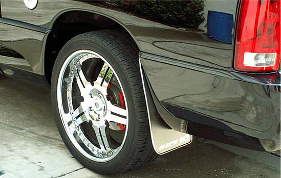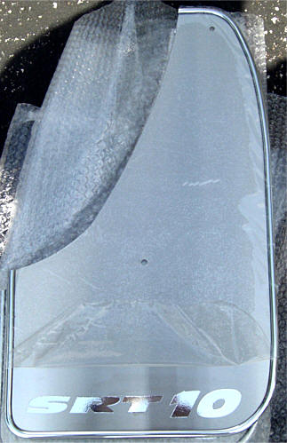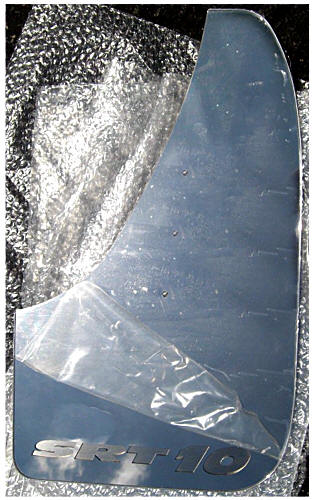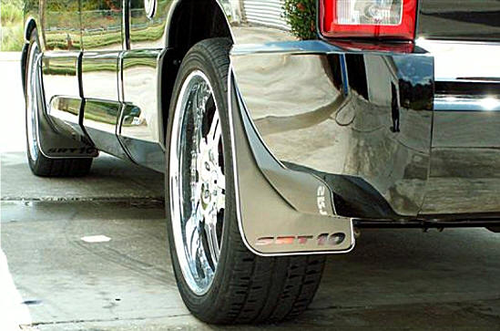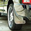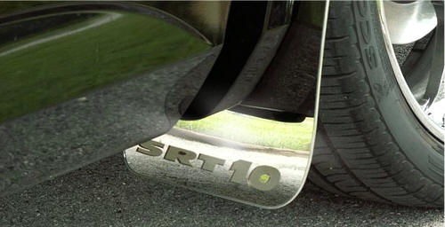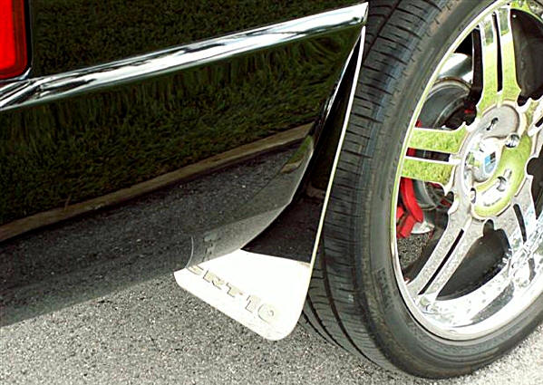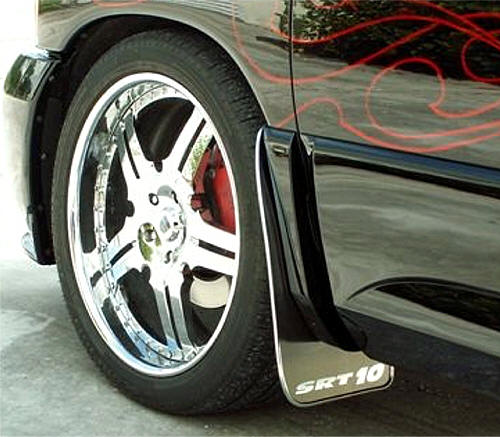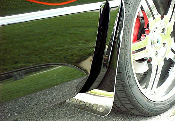 Set of 4 (2 front and 2 rear) heavy-duty metal splash guards designed specifically for the Dodge RAM SRT-10 Viper Truck. Easy to mount — designed to use existing factory bolts. Made with beautiful heavy-duty stainless steel plates featuring a highly polished mirror finish. Will not rust, corrode, or lose its luster.