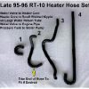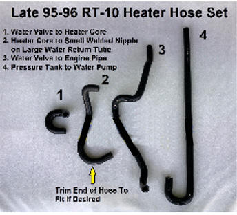 A complete set of heater hoses to complement your silicone radiator hoses. Contoured to match the original factory hoses, which have been discontinued. Includes hoses from the water valve to the engine and the heater core to the engine. Sold as a 4-piece set in black only; clamps not included.