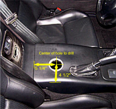 - Find the center point of the circle where the cup holder will be installed. Measure 4.5 inches (4½”) from the passenger side edge of the center console and make a small erasable mark. Then measure 5.25 inches (5¼”) from the rear lip of the console and make another mark that crosses the first. The “X” marks the center point. Refer to the diagram included.