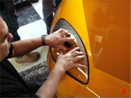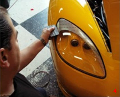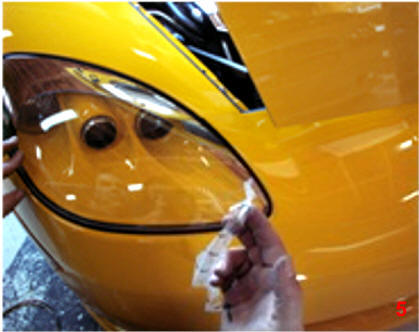 1. Clean your headlight first with soap and water, then with household isopropyl alcohol, and let it dry. Swipe the area ONLY where you will be placing the new cover with the adhesive promoter packet (provided). Be careful not to apply the adhesive promoter to the clear area of the lens where the chrome will not cover, as it will leave a visible smear. Once applied correctly, you may begin installation.