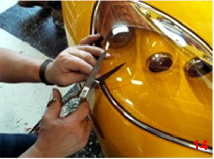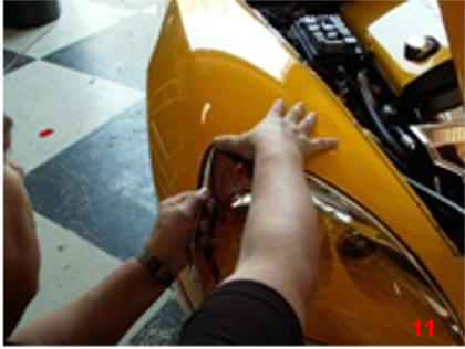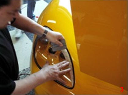 2. Refer to pictures as you continue through steps 2 and 3. Place the new cover over the headlight so that it fits along the upper edge, noting its position. If positioned correctly, there will be about a 1/8” space between the edge of the eyebrow and the edge of the light. This space will be covered by the chrome trim in the following steps. Begin permanent installation by peeling the release liner from the underside and carefully repositioning the cover from the small side to the larger section, using the plastic squeegee to press down evenly and avoid air pockets. Remove the protective liner.