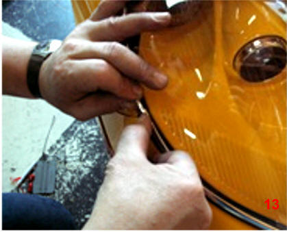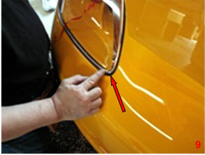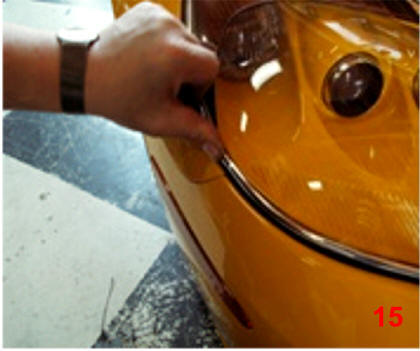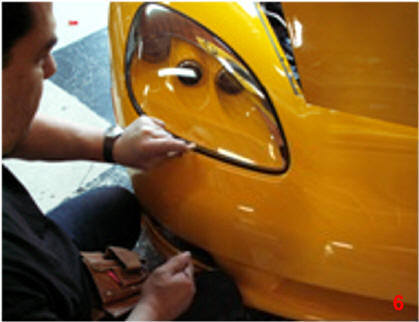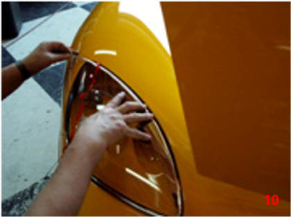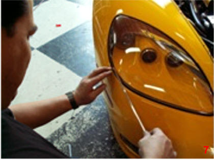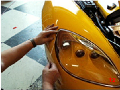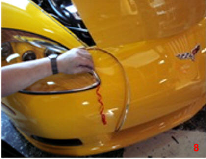 3. You have been provided with a length of chrome trim to cap the headlight cover and border the entire headlight. Apply a small bead of the adhesive promoter from the tube around the edge of the headlight. Begin placing the trim starting at the body seam by the headlight edge directly to the top side of the lens, NOT covering the 1/8” gap created during placement. Pre-bend the trim at corners to fit naturally. Continue around to the start point, mark the overlap slightly longer, then trim with scissors. Buckle the two ends together and press firmly to set a tight seam. Press the entire trim to permanently set. Repeat steps 1–3 for the opposite side. TECH TIP: Use a little instant adhesive at the butt seam to prevent separation or shrinkage over time.