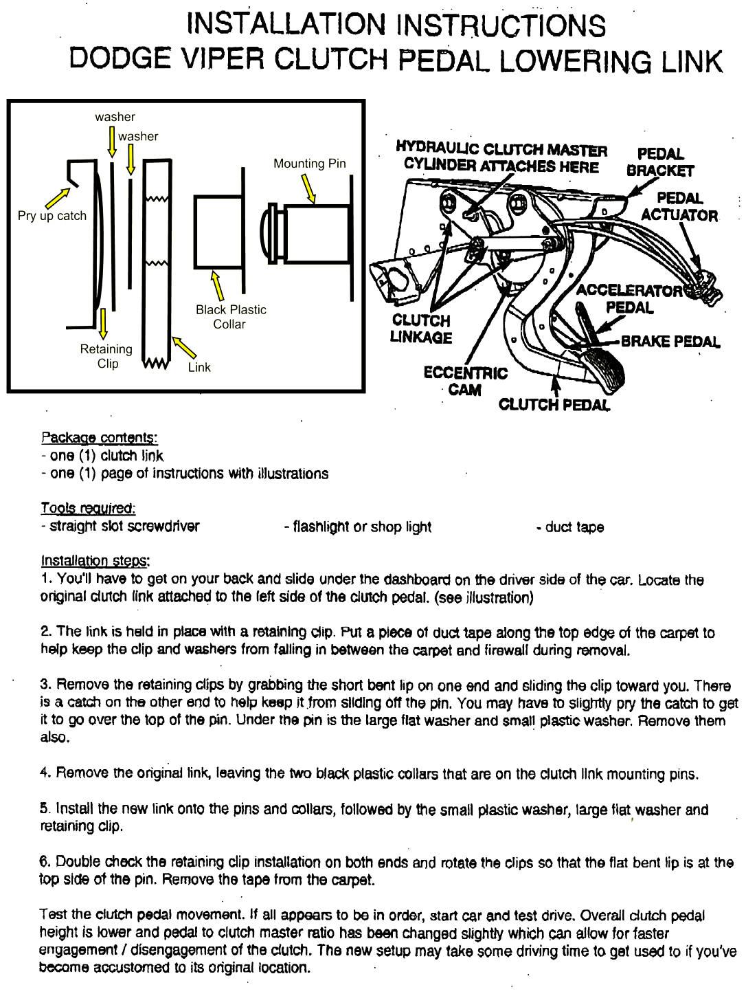 The Viper pedal kit includes a replacement clutch link that improves the clutch motion ratio, resulting in a shorter pedal throw and faster clutch actuation. The clutch pedal is lowered by approximately one inch to match the height of the brake pedal. The kit includes illustrated instructions and can be installed in minutes with no special tools required.
