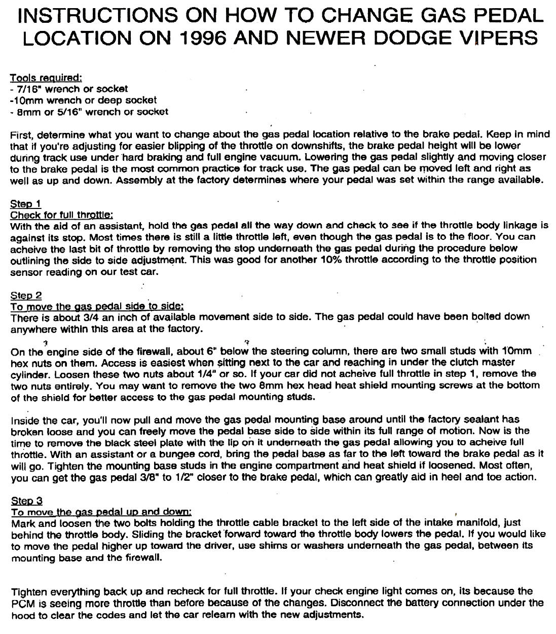 Detailed instructions are also provided on how to achieve full throttle and adjust the gas pedal location for easier heel-and-toe downshifting. Designed for 1996–2002 Vipers with adjustable pedal assemblies. Does not fit 1996 RT/10 models.
