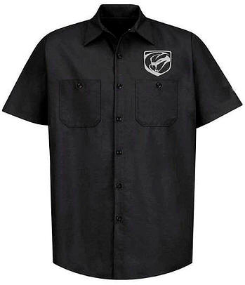 Dodge Viper black button-up collared shirt with embroidered logos on the left chest and sleeve. Made from 65% polyester and 35% cotton permanent-press poplin, it is fade-resistant and features a lined two-piece collar with permanent stays.
