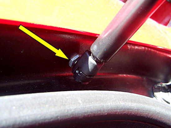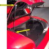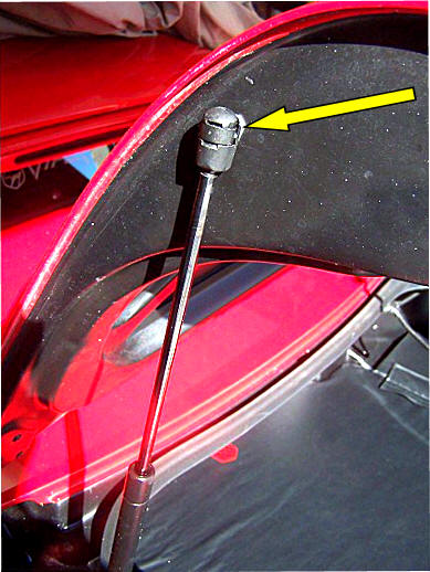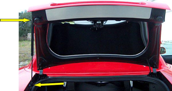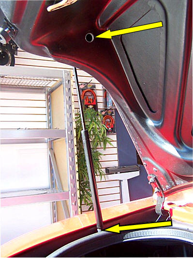 6. Extend the trunk to the maximum upright position and swing the lift arm down to where it will fasten to the trunk opening on the back of the car (BOTTOM). Ensure your mark is accurate. Drill a hole with the traditional bit into the black housing inside the trunk opening (see photos).