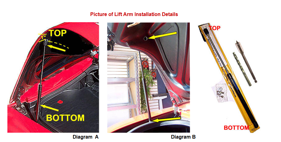 2. Take out the lift arm and hold it in the position you want it when the trunk lid is fully open (See Diagram A). The lift arm is already hyper-extended, so no need to pull it open further. Line up the lift arm so the top is approximately one inch from the trunk lip (see photos). Mark where the top will attach to the trunk lid side (TOP). Note: It doesn’t matter exactly where you install the lift arm as long as it fits the top and bottom of the trunk when open.