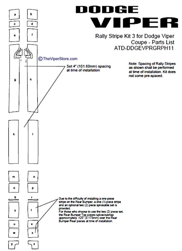 This stripe package is not just a box of 8″ (20.32 cm) straight strips. Our graphic kit consists of pre-fitted and contoured pieces as shown in the illustration. Straight stripes will not work on this vehicle. This kit is created specifically for the ‘6-’02 Dodge Viper Coupe (GTS) and will not fit any other vehicle.