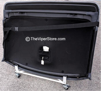 A cart on wheels specifically designed to carry hard tops. It has foam rubber padding wherever the top touches the cart. Tie-down strap included.