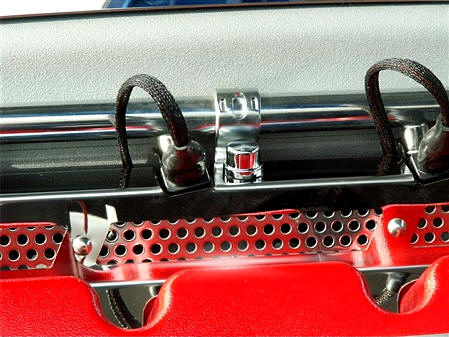 Align the three holes and reinstall the factory bolts. Tighten securely. Then press the chrome decorative bolt caps over each bolt until firmly in place.