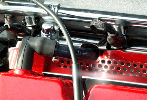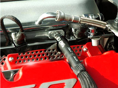 You may need to gently maneuver the insert under the pressure port cap (right side of the fuel rail). Allow the wires to rest between the top edge of the insert and the chrome fuel rail.