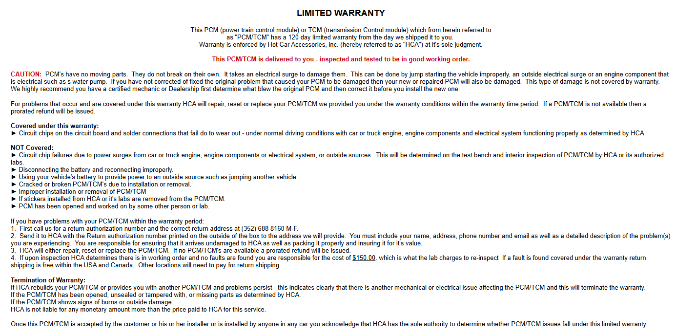 You must include a note with your name, address, phone number, VIN, mileage, and a description of the issue. Be sure to pack it securely and insure it for its full value.