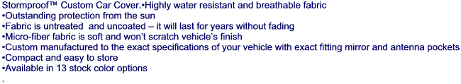 Stormproof is the only car cover material recommended for any climate or car cover need. It excels in every area except protection from dings. It will last for years and complement your vehicle with its available solid and two-tone color designs.