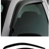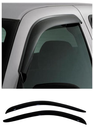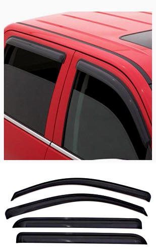 2004–2006 Dodge Ram SRT-10 Standard or Quad Cab external mount smoked tinted vent visor window deflectors (2-piece or 4-piece set). The original vent visor is an external mount side window deflector with a unique design that allows fresh air to circulate through open windows while keeping the weather out, reducing interior heat and window fogging. Made in the USA.